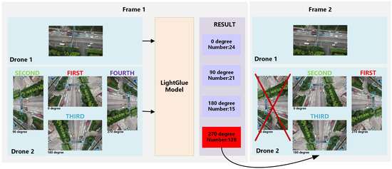 For this purpose, we designed the T-LightGlue model based on the characteristics of multi-drone multi-target tracking, as shown in Figure 3, where the T-LightGlue rotates the image in Drone 1 by 0, 90, 180, and 270 degrees in the first frame and then sequentially uses it for image-matching with the image in the same LightGlue Drone 2. Due to the huge difference in the number of keypoints at different angles, we save the rotation angle and the number of keypoints with the highest number of keypoints and pass it to the next frame when the image enters the next frame. We directly calculate the number of keypoints of the two drone images at the optimal rotation angle and compare it with 0.8 times the number of keypoints saved in the previous frame. If the value exceeds the threshold, recalculating the number of key points for the remaining three angles is unnecessary. Conversely, if the value falls below the threshold, the key points must be recalculated for the two adjacent angles. This is because it is nearly impossible for the drone to undergo a significant rotational change in adjacent frames. It is thus unnecessary to calculate the viewpoint of the non-adjacent frame.