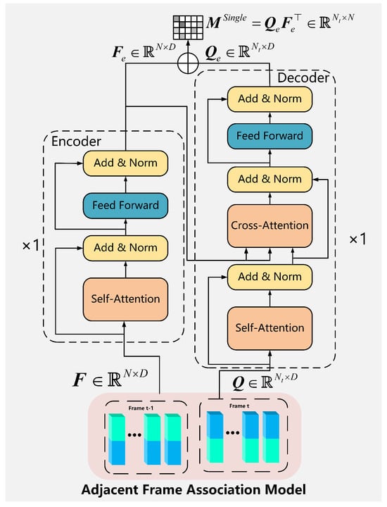 The Adjacent Frame Association Model employs the Transformer [43] architecture, as illustrated in Figure 7, comprising an encoder layer and a decoder layer. The Adjacent Frame Association Model is employed to process and , thereby generating enhanced feature matrices, designated as and . A similarity matrix between F and Q is derived through matrix multiplication. The score in matrix represents the degree of similarity between the i-th target in Q and the j-th target in F. Define to indicate no association.