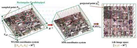 Equation (5) indicates that at least forty corresponding points are necessary to estimate the RPC between the WGS84 coordinate system and the pixel coordinate system. To define the correspondences between two spaces, first, we uniformly sample the RP space using the RP vertex information obtained after performing GEMVS as shown in Figure 2. Along each axis of the RP space, we sample points, and thus, total 3D points are sampled in the RP space, where , and stand for longitude, latitude, and height, respectively. Then, all 3D points are projected onto by the following equations, including the homography matrix and pin-hole camera parameters :