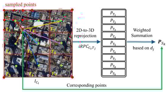 2D-to-3D correspondence search process. For example, an image space is divided into tiles. Red-color points are uniform samples in image . A sampled point is reprojected to geo-referencing space by each tile’s inverse RPCs to obtain . Then, all are weighted averaged by the distance of the point to each tile center to obtain the final correspondence .