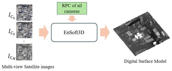 The Rational Polynomial Coefficient (RPC) is a common mathematical representation of the pushbroom camera model, and it has been widely used in satellite stereo image matching [,,]. As far as two-view satellite stereo images are concerned, satellite images can be rectified using RPC parameters. Then, stereo matching methods find pixel correspondences between the images. Stereo matching can be performed by using conventional methods such as S2P [,] or deep learning methods by transforming RPC parameters into tensor forms [].