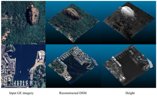 As the first qualitative analysis, we used ten multi-view GE images for the 3D reconstructions of two landmarks: one is Sigiriya, Sri Lanka (7°57′22″N 80°45′32″E) and the other is Sydney, Australia (33°51′25″S 151°12′42″E). The 3D DSM and height map results are shown in Figure 5. As shown in the figure, the proposed method provides reasonably accurate RPC parameters for the 3D reconstruction of complex terrain and building areas.