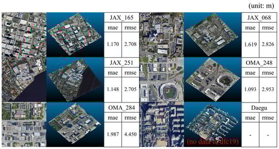 Figure 8 shows the error analysis results of the six test areas. In each test, one of the input satellite images, 3D DSM, and MAE and RMSE error analysis are presented. The Daegu dataset does not provide a GT height map; thus, only the DSM result is shown. In this analysis, the average MAE is 1.366 m, and the RMSE is 3.128 m. Among the results, OMA_284 shows the largest error. Except for the OMA_284 tile, the MAE is approximately 1.0~1.5 m. The large error in the OMA_284 tile is caused by new buildings in the GE images. In this test image, we find that there are a couple of new buildings; however, there is no height information in the GP map. This means that the new buildings have been built after the GT generation. An analysis of this issue is discussed more in Section Discussion about the Error of the OMA_284 Tile.