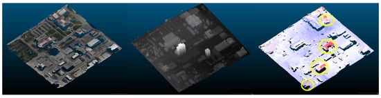 Error analysis of the OMA_284 tile. From the left, reconstructed DSM, GT model, and error map.