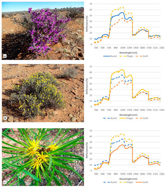 Images and spectral reflectance based on the analytical spectral device of three species examined in the study: (a) Ruschia intricata, (b) Pteronia glomerata and (c) Geigeria filifolia.