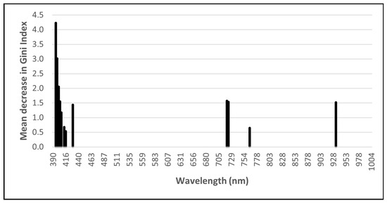 Variable importance is a useful by-product of random forest (RF), used for feature ranking. Thus, RF variable importance reveals which wavebands (or waveband set) are most relevant for classification [60]. In this study, Gini importance was used as a measure of waveband importance. The Gini importance score quantifies the predictive ability of each variable; hence, it gained importance measures over all the trees in the RF [60]. The most essential features from a data set for classifying plant species were identified through feature selection. The best spectral bands were chosen using the feature selection algorithm known as guided regularised random forest (GRRF).
