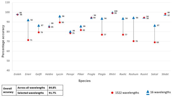 Percentage accuracy for discriminating between the 15 species using all 1522 wavelengths from the analytical spectral device data set vs only the selected 16 wavelengths as predictor variables in the random forest classifier.