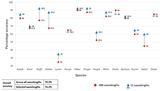 Percentage accuracy for discriminating between the 15 species using all 224 wavelengths from the unmanned aerial vehicle hyperspectral data set vs only the selected 12 wavelengths as predictor variables in the random forest classifier.