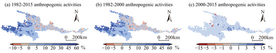 Referring to [59], the anthropogenic activities in our study are categorized into ecological restoration and over-farming. Areas converted from unused land or farmland into forest, grassland, or wetlands are classified as ecological restoration areas. Conversely, areas where unused land, forest, grassland, or wetlands have been converted into farmland are designated as over-farming areas. Based on this classification, data on anthropogenic activities for six periods were obtained and expressed as percentages in pixels. The anthropogenic magnitude is calculated based on the proportions of ecological restoration and over-farming areas at a 0.1° resolution: