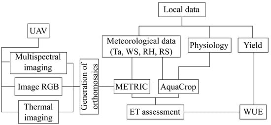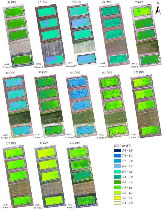 METRICTM is a variant of the SEBAL (Surface Energy Balance Algorithm for Land) model that calculates crop evapotranspiration () by analyzing the surface energy balance using satellite information [41,42]. However, due to the lack of spatial resolution for plot-level studies and the scarcity of real-time data [17], it is necessary to employ high-resolution data, free of atmospheric errors and available in real time, provided by UAVs to improve the accuracy of estimation and facilitate uniform crop monitoring [43].