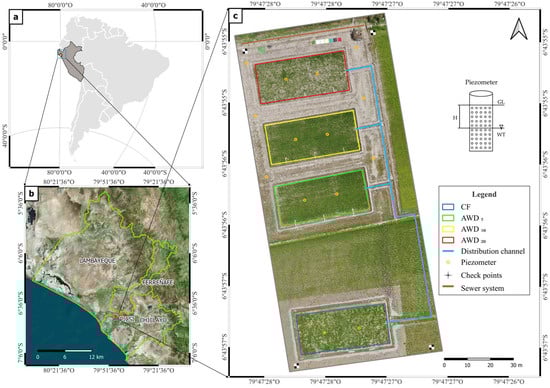 Study area: (a) geographical location; (b) Lambayeque region; (c) Experimental Agricultural Station (EEA) “Vista Florida” with four plots of each, divided into three subplots of m, with two irrigation regimes of continuous flooding (CF) and alternating wetting and drying (AWD), the latter having water levels at 5 cm, 10 cm, and 20 cm below the soil surface level (, and ).