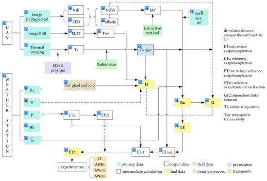 Figure 3 illustrates the step-by-step process for estimating crop evapotranspiration (), adapted from the approach by Ramos-Fernández et al. [25], with modifications specific to this study. This estimation utilized remote sensing data and field measurements, incorporating UAV flights and climate data collection, as described below.