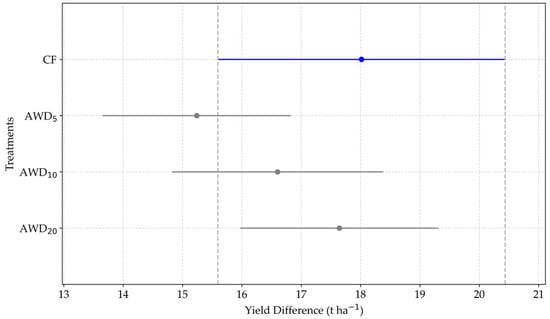 To analyze the yield, tests for normality and homogeneity of variances were conducted, followed by an analysis of variance (ANOVA) to determine significant differences between treatments. The ANOVA results indicated that there were no significant differences in yield among the treatments (p > 0.05). The Tukey HSD test further confirmed the absence of significant differences in yield concerning the CF treatment. Figure 4 shows that there were no significant differences in yield among the treatments evaluated.