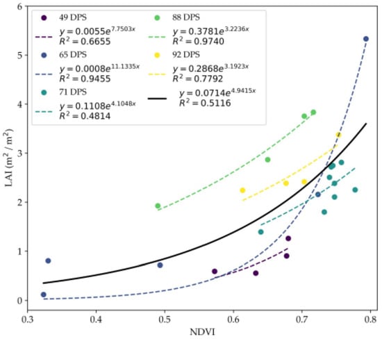 Previous studies exploring the correlation between the LAI and NDVI include research conducted on semi-arid grasslands in Inner Mongolia, China, by Fan et al. [36], who developed a general exponential correlation (, R = 0.77). Additionally, Quispe et al. [40] studied rice fields in the La Molina District, Lima, Peru, and derived an exponential correlation with the equation , which resulted in a coefficient of determination (R2) of 0.539 and a root mean square error (RMSE) of 0.35.