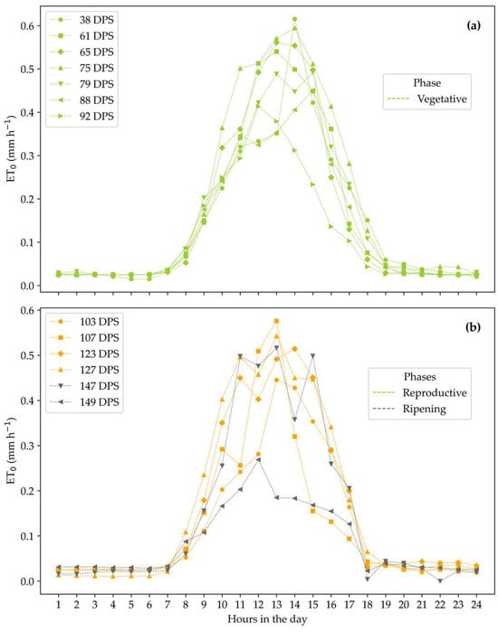 Figure 7 presents the hourly variation in reference evapotranspiration (ET0) during the 24 h of the 13 flight days, calculated using the Penman–Monteith method with data from the ATMOS-41 portable weather station. The flight days are grouped according to crop stage: vegetative (38, 61, 65, 75, 79, 88, and 92 days after planting, DPS), reproductive (103, 107, 123, and 127 DPS), and ripening (147 and 149 DPS).