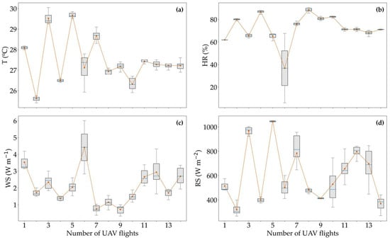 Meteorological conditions according to UAV flights: (a) temperature (T, °C), (b) relative humidity (RH, %), (c) wind speed (WS, ), and (d) solar radiation (SR, ).