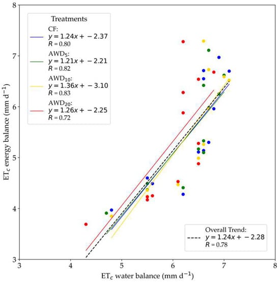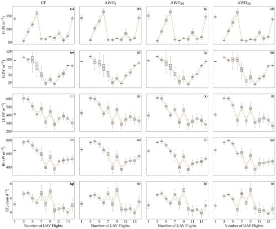 CF irrigation showed consistent values for net radiation (Rn), soil heat flux (G), sensible heat flux (H), and latent heat flux (LE). In contrast, AWD irrigation directly influenced crop temperature, causing variations in these energy components.