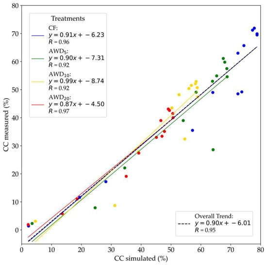 To estimate crop evapotranspiration, the AquaCrop model [49], previously parameterized with field information related to climate, crops, irrigation, and soil [50], was used. AquaCrop simulated crop development and water balance components under flooded irrigation (CF) [51,52] and alternative wetting and drying (AWD) irrigation [18], from January to June 2023.