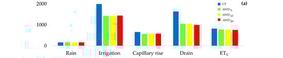 - Alauddin, M.; Rashid Sarker, M.A.; Islam, Z.; Tisdell, C. Adoption of Alternate Wetting and Drying (AWD) Irrigation as a Water-Saving Technology in Bangladesh: Economic and Environmental Considerations. Land Use Policy 2020, 91, 104430. [Google Scholar] [CrossRef]