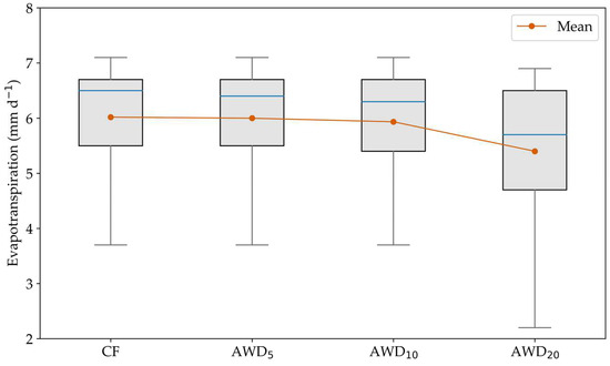 Water scarcity is becoming an increasingly pressing challenge in rice farming [16]. The water needed for the crop depends on crop evapotranspiration (), which represents the water consumed by a cultivated area. ET is affected by climatic factors such as air temperature, wind speed, solar radiation, relative humidity, and sunshine hours, as well as crop characteristics like vegetation height, phenological stage, and planting density [17].