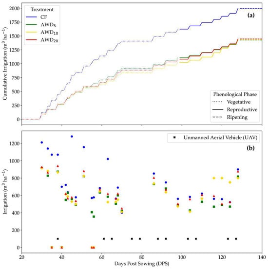 Thermal and multispectral imagery was collected through flights using a Matrice 300 drone, supplemented with field data to assess the spatial Leaf Area Index (LAI) and adjust the thermal bands. The crop evapotranspiration () of the rice variety INIA 515 was estimated under two irrigation methods: continuous flooding (CF) and alternating wetting and drying (AWD) at depths of 5, 10, and 20 cm below the soil surface.