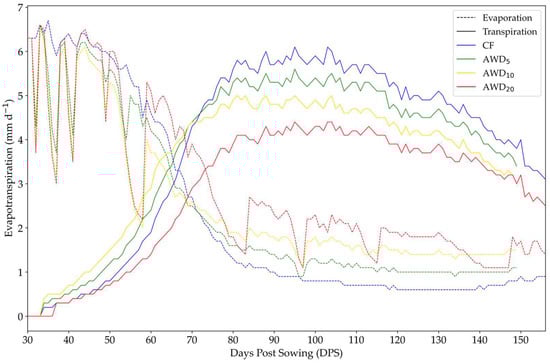 As shown in Figure 16, transpiration peaked around 96 DPS, coinciding with the maximum tillering stage for CF. However, for , , and , this peak extended until approximately 103 DPS. This delay in development is related to the initial irrigation deficiency during the early tillering stage, which prolonged the flowering dates until 122 and 126 DPS.