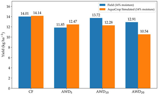 The model also exhibited acceptable performance in simulating water balance components, showing significant differences in percolation between CF and AWD. Although CF resulted in the highest yield, AWD achieved the best balance between yield and water use, underlining the potential of AWD strategies, especially at a 10 cm depth, to enhance water productivity. These results support the adoption of AWD as a viable option in water-scarce areas, similar to findings by authors such as Yang et al. [33] and Gao et al. [15], who also observed benefits in alternative irrigation practices.