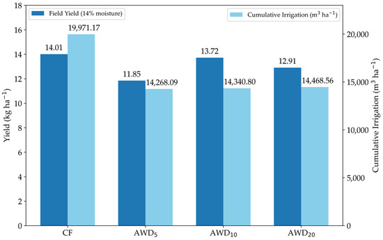 Meanwhile, as shown in Figure 16, the observed increase in rice yield per hectare under the regime may be attributed to improved soil aeration. These findings align with the results reported by Elsadek et al. [49]. Conversely, the decrease in yield observed in the and treatments could be attributed to factors related to soil chemical conditions and irrigation management. In particular, soils with low organic carbon content and elevated pH may have promoted ammonia volatilization, reducing nitrogen availability for plants. This reduction in essential nitrogen uptake could have negatively affected rice productivity. Additionally, the water deficit associated with these irrigation regimes may have further contributed to a reduction in photosynthesis, ultimately impacting crop yield, as highlighted by Gao et al. [15] and Hirayama et al. [69].