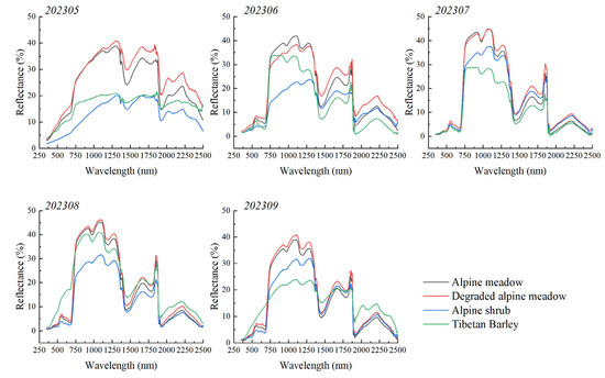 Changes in spectral features are associated with phenological stages of plants, including greening, flowering, maturity and wilting. These stages exhibit distinct reflectance spectral features, which have been demonstrated in multi-temporal spectral studies across different regions and vegetation types [34,35,36]. For alpine meadows, greening starts in April, blooming and maturity occur from July to August, and wilting starts in September. As a result, the average spectral reflectance of the different vegetation types is at its highest in July and at its lowest in May [37].