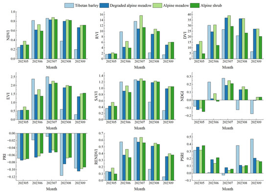 All vegetation indices showed an initial increase followed by a decrease over time, peaking in July and reaching a minimum in either May or September. Tibetan barley, as an artificial vegetation type, showed the most pronounced changes, with a rapid increase from June to July and a significant decrease from August to September. In contrast, alpine meadows, degraded alpine meadows, and alpine shrubs showed a more gradual increase in vegetation indices from May to June, followed by slower fluctuations. In general, the vegetation indices of alpine meadows and Tibetan barley were higher, followed by degraded alpine meadows and alpine shrubs. However, these patterns varied between different months and vegetation indices. Tibetan barley showed significant differences from the other types in key months for all vegetation indices, especially in August–September for NDVI, RVI, DVI, EVI, SAVI, NDGI, and RENDVI, and in June-July for PRI and PSRI. Alpine meadows generally had higher vegetation indices than degraded alpine meadows, although the differences were not significant for most indices. In particular, RVI and NDGI showed significant differences between alpine meadows and degraded alpine meadows in June–August and in June. Alpine shrubs did not differ significantly from alpine meadows and degraded alpine meadows in most vegetation indices, but DVI and NDGI could distinguish alpine shrubs from other types relatively well. For example, alpine shrubs were significantly different from other types in all months for DVI and in June for NDGI (Figure 5).