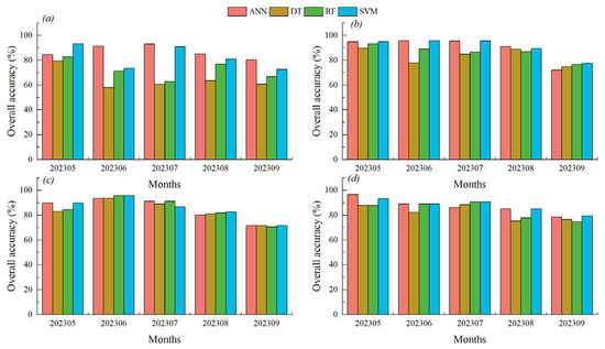 Overall accuracy of vegetation classification under different data processing and classification methods from May 2023 to September 2023. Note: (a–d) refer to original bands, First-order derivative reflectance, continuum remove and characteristic parameters. Artificial neural network (ANN), decision tree (DT), random forest (RF) and support vector machine (SVM).