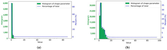 However, due to the approximate solutions provided by the MLE method used for K distribution and Pareto distribution, some shape parameter estimates were notably larger than expected. Figure 3 illustrates the data distribution of these shape parameters for both distribution types, with a maximum value limit set at 100 to focus on details in high-density regions. In HH-polarized sea clutter data, 0.6% of K distribution shape parameters exceeded 30, and 0.3% of Pareto distribution shape parameters exceeded 20. In VV polarization mode, these percentages were 0.5% and 4%, respectively.