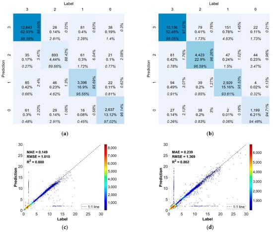 Figure 4a,b depict the confusion matrix heatmaps of the sea clutter amplitude distribution classification task under HH and VV polarization, respectively. Class 3 represents the Pareto distribution, class 2 represents the K distribution, class 1 represents the Weibull distribution, and class 0 represents the Log-normal distribution. Taking the correct identification of HH-polarized sea clutter samples following the Pareto distribution as an example, the percentage on the right of the cell indicates a precision of 98.85%, the percentage at the bottom indicates a recall of 98.59%, the middle number indicates a count of 12,643 sea clutter samples, and the percentage below the number represents its proportion in the total test samples, at 62.93%. Although the data of HH-polarized sea clutter K distribution are sparse, accounting for less than 5%, they still perform well in the classification task, with a precision of 88.42%. Pareto distribution data are the most abundant and show the best performance, with precision exceeding 95% for the other distributions as well. In VV polarization mode, with an increase in K distribution data, the classification precision significantly improves to 96.26%, while the Pareto distribution continues to perform the best with a precision of 97.57%, and the precision for the other distributions remains around 95%.