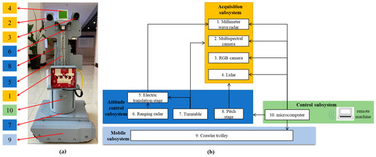 The acquisition subsystem comprises four sensors: 1. millimeter-wave radar; 2. multispectral camera; 3. RGB camera; 4. LiDAR. Among these, the millimeter-wave radar and the laser radar are active sensors that transmit and receive signals. Conversely, the multispectral camera and RGB camera function as passive sensors, collecting data directly from the target scene.