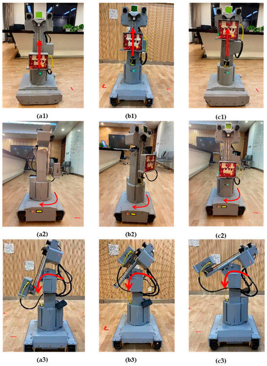 System attitude control. (a1,b1,c1) Electric translation stage moves 0 cm, 10 cm, and 20 cm; (a2,b2,c2) Turntable rotates 0°, 45°, and 90°; (a3,b3,c3) Pitch stage tilt 30°, 45°, and 60°.