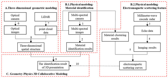 (C) Geometric-physical 3D collaborative modeling is implemented by steps 9–10. In step 9, the multispectral material recognition results from step 2 are fused with the laser radar data, achieving a one-to-one correspondence between physical information and the three-dimensional geometric space, thereby intuitively presenting the material recognition results. In step 10, the same method as step 9 is used to select a specific area in the three-dimensional space and invert the electromagnetic scattering characteristics of that area.