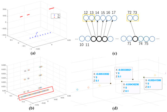 The received echo originates from 12 transmitting antennas and 16 receiving antenna channels, forming a real aperture, as shown in Figure 6a. This configuration results in 192 equivalent apertures, depicted in Figure 6b. However, due to the overlap of the aperture positions, there are actually only 134 unique spatial positions of the apertures. The overlapping schematic is illustrated in Figure 6c, which is a larger representation of the red box in Figure 6b. More importantly, as shown in Figure 6d, the interval of equivalent aperture at the same height is 1/4 of the wavelength.