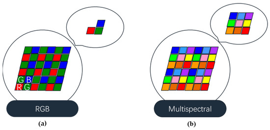 Compared to ordinary optical cameras, multispectral cameras can capture a wider range of spectral information, enabling the distinction of targets made from different materials [22]. As shown in Figure 7, the filters of ordinary RGB cameras and multispectral cameras differ significantly. For example, the multispectral camera in Figure 3b features 9 channels spanning 620–800 nm, with intermediate frequency bands at 633 nm, 653 nm, 674 nm, 690 nm, 712 nm, 732 nm, 745 nm, 764 nm, and 781 nm. In contrast, ordinary RGB cameras filter three bands: red light (615–620 nm), green light (530–540 nm), and blue light (460–470 nm). Multispectral cameras obtain reflection information from different materials by illuminating the target with light sources of various wavelengths. By analyzing the results across these wavelengths, the unique spectral characteristic curve of each material can be determined.