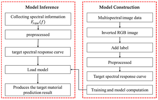 The process of model construction begins with the use of the inverted RGB image from the multispectral image data for annotating different materials using LabelMe. Next, the multispectral image data are read and segmented. The data are then preprocessed, where the reflectance of each pixel is calibrated to minimize the impact of varying lighting conditions on the spectral trend, thereby obtaining the target spectral response curve. Finally, a certain proportion of data for each material is randomly extracted and fed into a random forest classifier for training and model computation. In the model inference phase, after the system collects the target multispectral data, the data are standardized and preprocessed, then input into the trained model. The model then produces the target material prediction result.