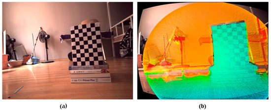 The preliminary registration of RGB camera and LiDAR. (a) Experimental scene of RGB camera and LiDAR registration; (b) Preliminary registration results of RGB camera and LiDAR.