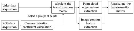 To solve the above question, we propose a new idea to improve the accuracy and applicability of registration, which combines the hand–eye calibration method with the edge feature point matching method, shown in Figure 10. By using the obtained feature points and the initial external parameter matrix, the method realizes the high-precision registration between the RGB camera and the LiDAR without considering the distortion of the internal parameter matrix of the camera. The specific algorithm flow is as follows: