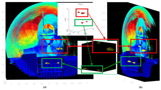 The selected millimeter-wave radar consists of four 3-transmit and 4-receive RF chips cascaded, forming a 12-transmit and 16-receive TDMA antenna array. Figure 3a shows a physical image of the 77 GHz millimeter-wave cascade RF chip. The red box in the figure highlights the 16 receiving antennas of the cascade radar, while the blue box indicates the 12 transmitting antennas. This millimeter-wave radar is utilized to perform high-resolution three-dimensional imaging of the target, effectively extracting the spatial position, geometric characteristics, and scattering properties of the target. Additionally, the direction of the transmitted signal can be controlled by digital beamforming (DBF) technology, enabling a scanning area significantly larger than that of conventional radars, with a horizontal field of view (FOV) of [−60°, 60°].