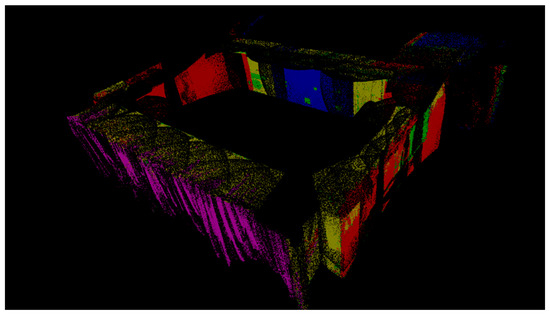 This scene is smaller, a wall containing a variety of materials, but the angle shown is different from the above results. It should be noted that in addition to the RGB color, the part of the color with material classification is very small, which is because, as mentioned in the text (3.1.2), the FOV of the four sensors of the system are different, which is caused by the minimum of the multispectral camera. The number of point clouds is 388,032, and the file size is 4.81 MB.