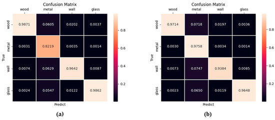 Confusion matrix. (a) Precision confusion matrix; (b) Recall confusion matrix.