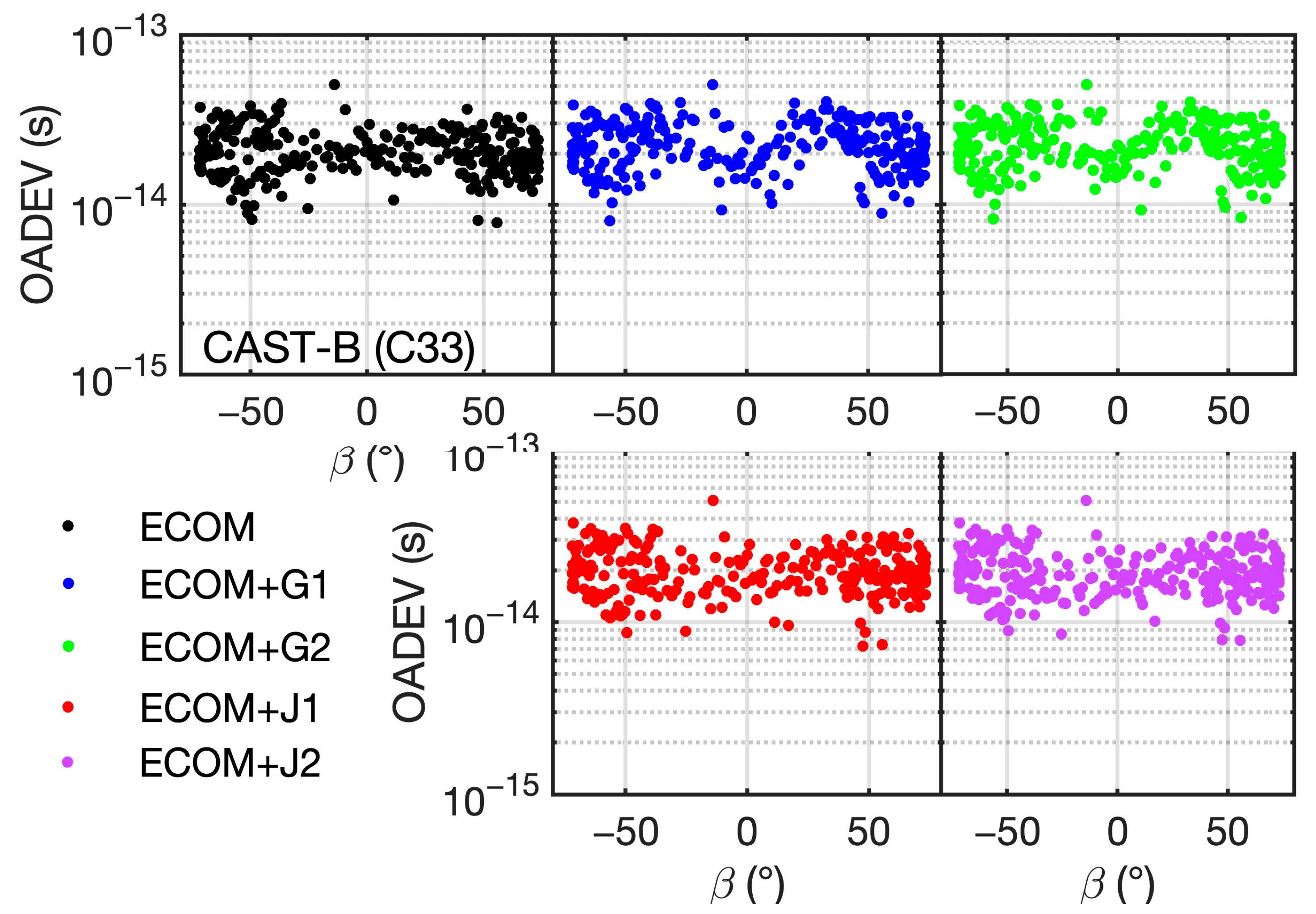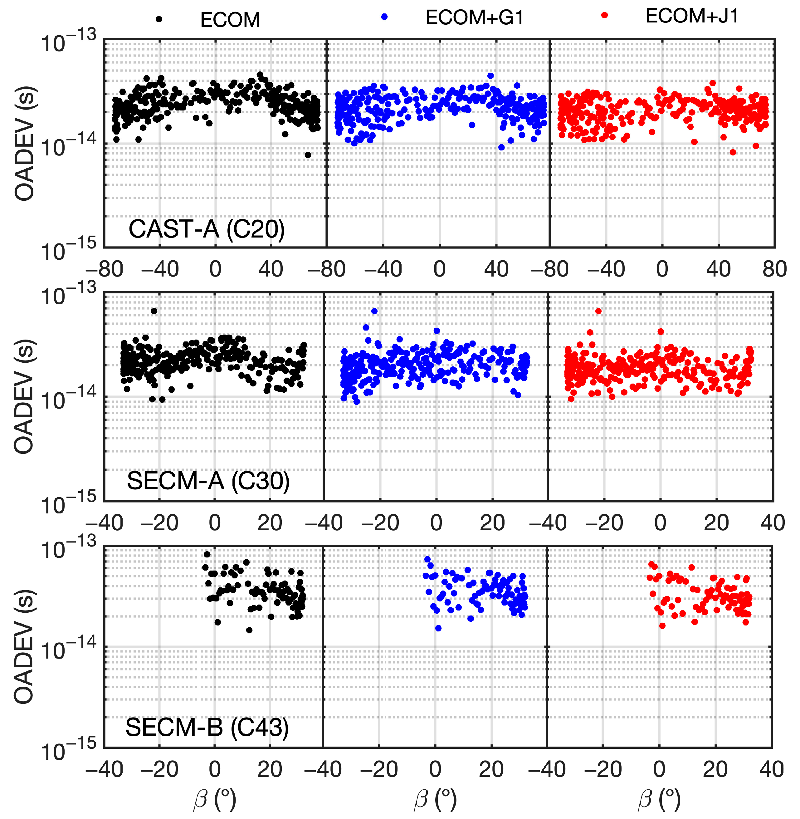 - An a priori model established for the satellite body can reduce the systematic errors in ECOM orbits, and the model established using ISL observation demonstrates superior performance compared to solely using L-band observations. With the enhanced a priori model, the slopes in the SLR residual of CAST and SECM satellites are reduced from −0.097 cm/deg and 0.067 cm/deg to −0.004 cm/deg and −0.009 cm/deg, respectively. The STD values are reduced with an improvement of 21.8% and 26.6%, respectively. Furthermore, a reduced β-dependent variation is observed in the OADEV of the corresponding clock offset. Nevertheless, systematic biases are still present in the SRL residual when using the a priori model. It is suspected that there are other effects that are yet to be properly accounted for.