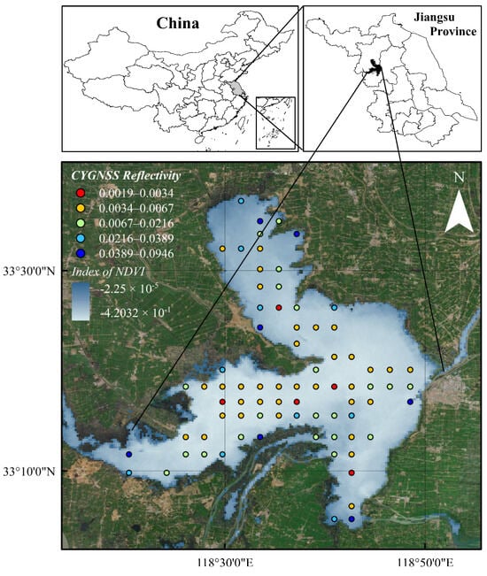 Distribution of averaged CYGNSS reflection points in the Hongze Lake.