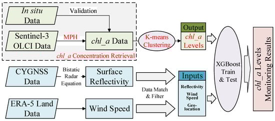 In this study, chl_a concentration was first retrieved from Sentinel-3 OLCI imagery using the Maximum Peak Height (MPH) algorithm and validated with in situ chl_a concentration measurement. The extensive coverage of OLCI data not only compensates for the limited in situ sampling but also provides more data for modeling. After data matching and quality control, the chl_a concentration was classified into 2 to 5 categories using the K-means clustering algorithm. These categorized levels were labeled and used as references and output levels to establish and train the monitoring model. Additionally, surface reflectivity was derived using the bistatic radar equation, and wind speed data were extracted from the ERA5-Land dataset to serve as inputs for the XGBoost monitoring model. This design ensures a well-structured approach, integrating multisource data and clustering methods to build an algal bloom monitoring model. The flowchart of this study is illustrated in Figure 2.
