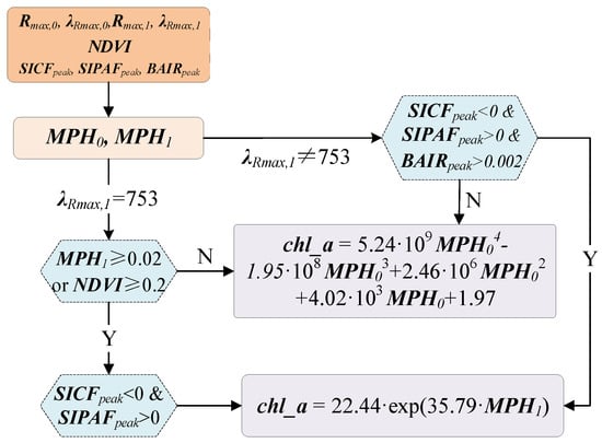 The MPH algorithm [37] is designed to provide quantitative estimates of chl_a in optically complex inland and nearshore waters and detect cyanobacterial blooms, surface-floating algae, and aquatic plants. It has undergone rigorous validation across a diverse array of inland lakes globally, covering a wide range of trophic levels and water types. The algorithm has consistently demonstrated strong overall performance and is widely applicable to most lakes, with the exception of certain oligotrophic systems. The algorithm utilizes the narrow red-edge bands at 681, 709, and 753 nm, with unique spectral features in the 665 and 885 nm bands for cyanobacteria detection. It identifies the location of the maximum peak in the 753 nm band to determine the presence of floating material and cyanobacterial blooms. Specifically, the algorithm focuses on the 753 nm maximum reflectivity peak to ascertain whether the water surface is heavily colonized with phytoplankton or macrophytes. Matthews [38] improved the algorithm by increasing the number of bands to 620, 664, 681, 709, 753, and 885 nm. During the retrieval process, the peak reflectivity (, ) and the corresponding wavelengths (, ) were determined for two different spectral ranges used for the MPH calculations. Here, represents the maximum reflectivity peaks at the band center wavelengths of 681 and 709, and represents the maximum reflectivity peaks at the band center wavelengths of 681, 709, and 753. The MPH values, and , are calculated from these maximum reflectivity peaks, where denotes the peak reflectivity of band with the center wavelength being i and the integer (e.g., ) denotes the band center wavelength: