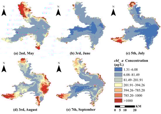 In this study, Sentinel-3 OLCI imagery from May to September 2023 was used to retrieve chl_a concentration within the Hongze Lake region using the MPH algorithm. Due to limitations imposed by weather conditions and revisit cycles, reliable OLCI images were available for 22 days during this period. To validate the reliability of the chl_a concentration retrieval, in situ data were collected in the Hongze Lake region on 11 May 2023, and were used for comparison with the retrieval results. The chl_a concentration results for one day each month are selected and presented here (see Figure 4).