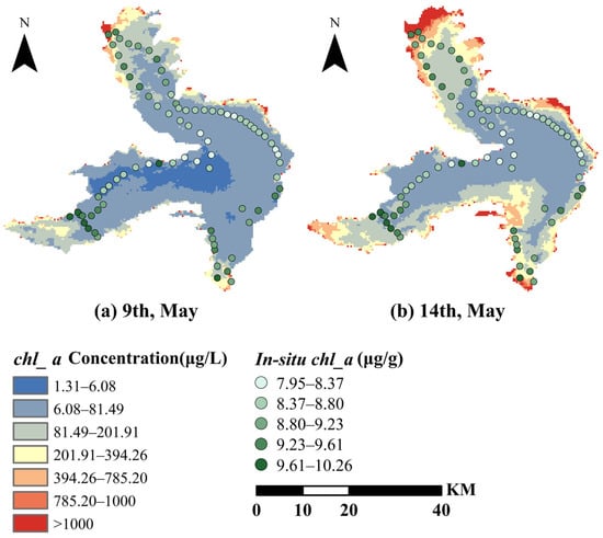 Since the Sentinel-3 constellation did not capture valid OLCI images on 11 May 2023, this study validated the chl_a concentration retrieval results using data from 9 and 14 May, which were close to that date. Figure 5 shows the distribution between retrieval results and in situ data for chl_a concentration. The base map shows the retrieval results of concentration, and the dots show the in situ data. The visualization offers a clear comparison between the retrieval model’s chl_a distribution and real-world data, providing valuable insights into its performance. By highlighting both the alignment and discrepancies between the modeled retrieval values and in situ measurements, it sheds light on the model’s accuracy and reliability. The results demonstrate that the retrieval model captures the spatial distribution of chl_a in aquatic environments with notable precision, indicating strong predictive capabilities and suitability for real-world applications.